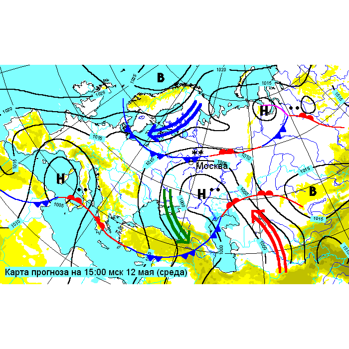 Прогноз погоды на 12 мая. Температура ночью +9..+11 С, днем +16..+18 С Ветер восточный , 2 - 4 м/с, Облачно, Кратковременные осадки.